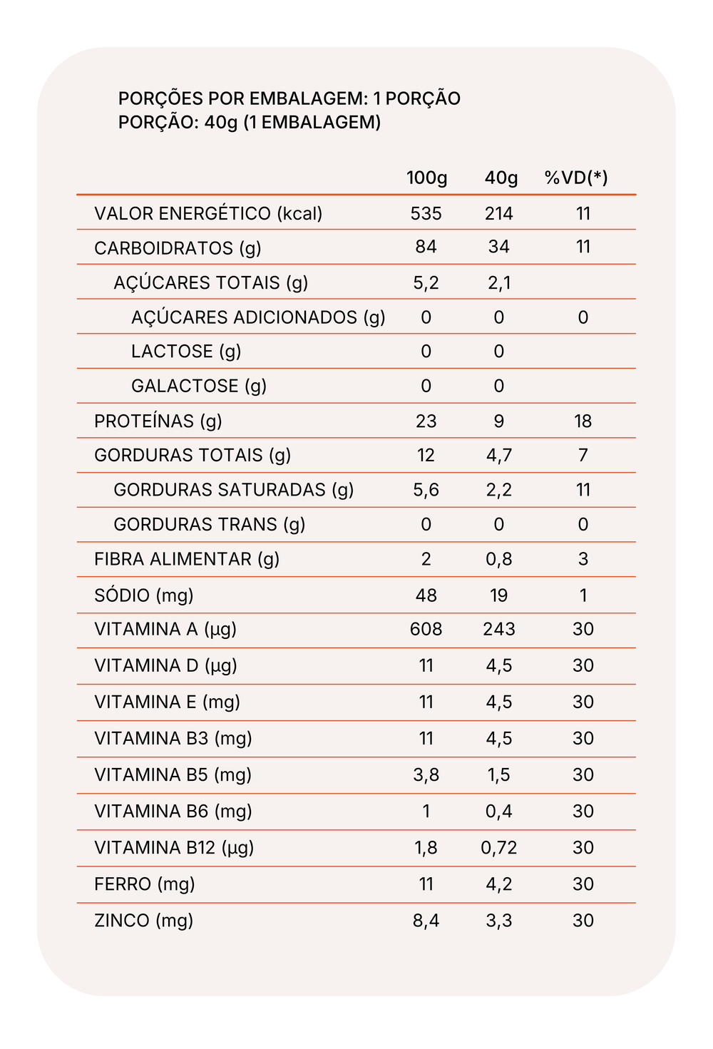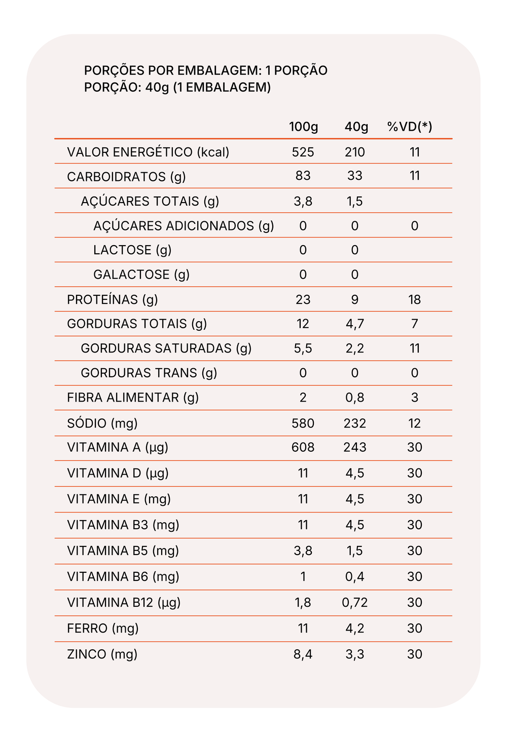 Beterraba: Polvilho azedo, batata doce in natura, colágeno hidrolisado, gordura de palma, beterraba in natura, salsa in natura, sal e mix de vitaminas e minerais